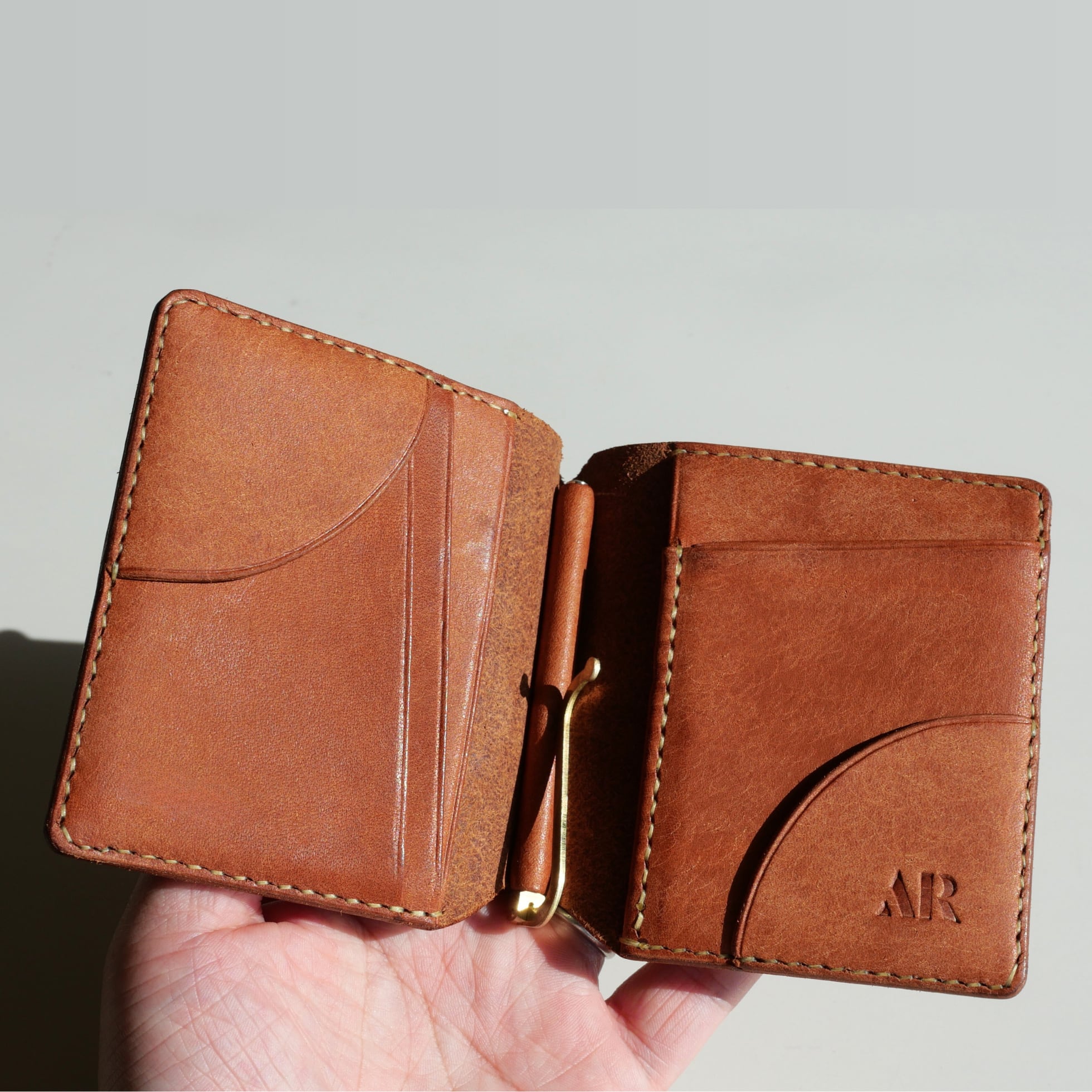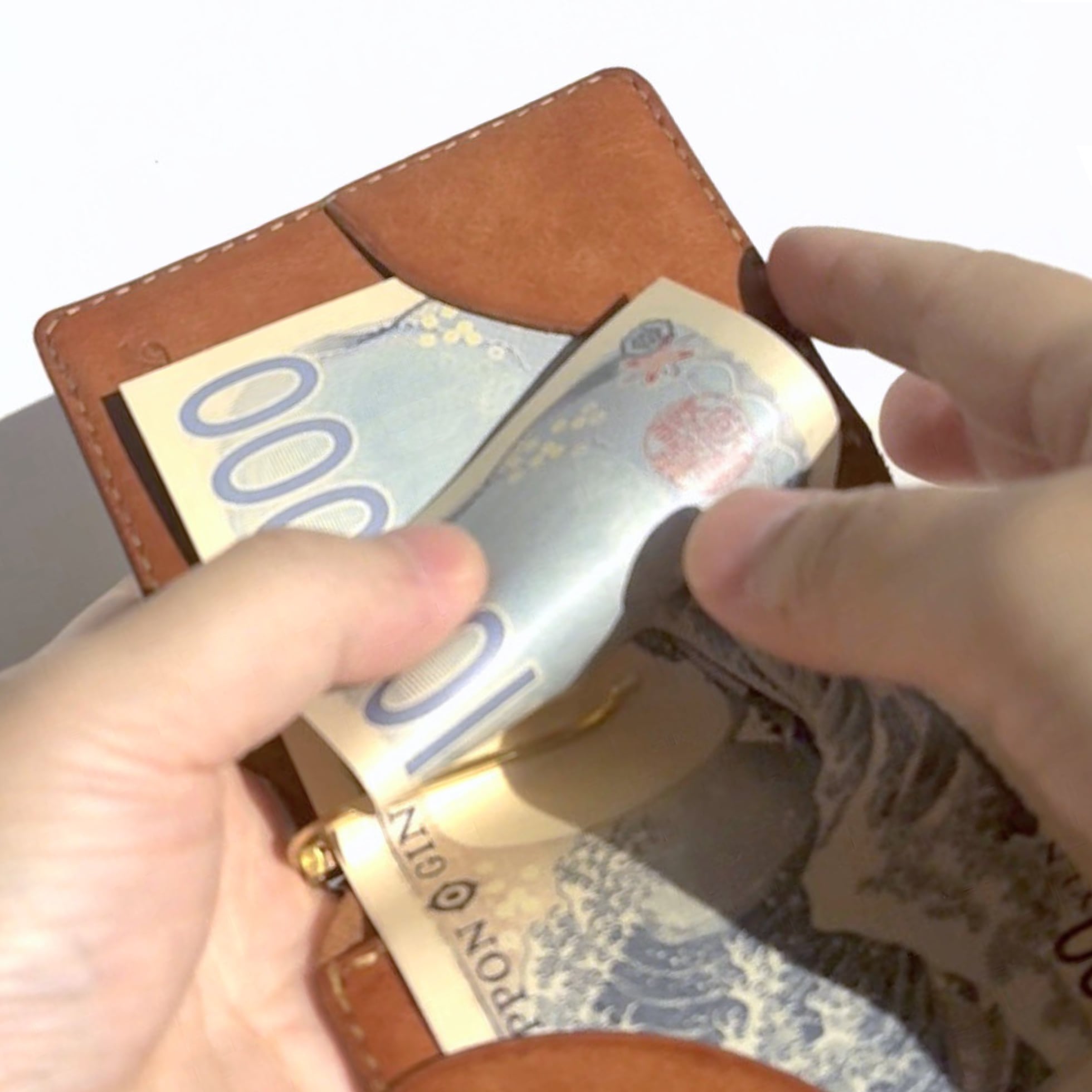 RUFUのマネークリップは、支払いの所作そのものをもっと上品に演出するため、両端にお札を抑える扇形の革チップをあしらいました。革チップから一枚一枚お札を取り出す所作には気品を感じ、見ている人を惹きつけます。