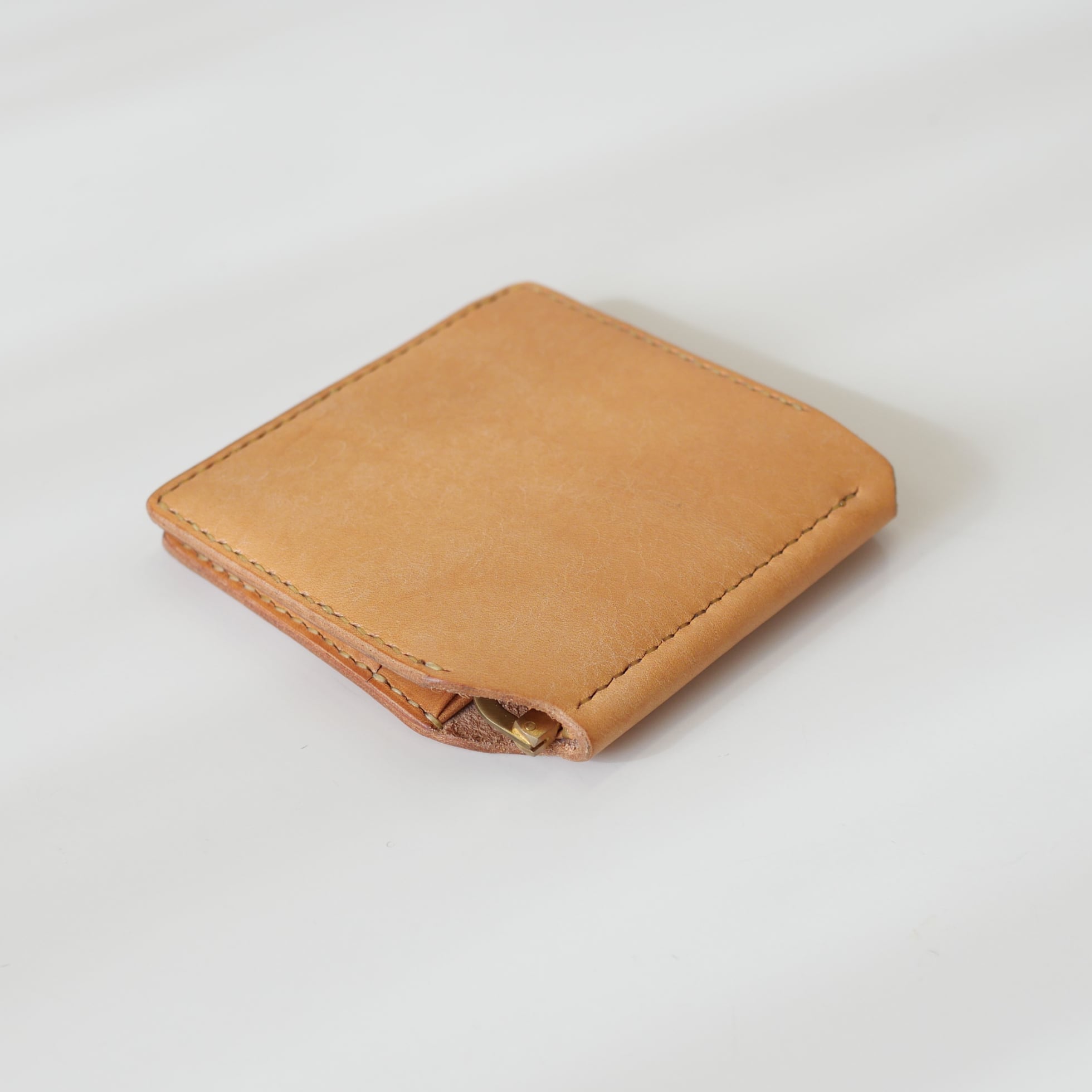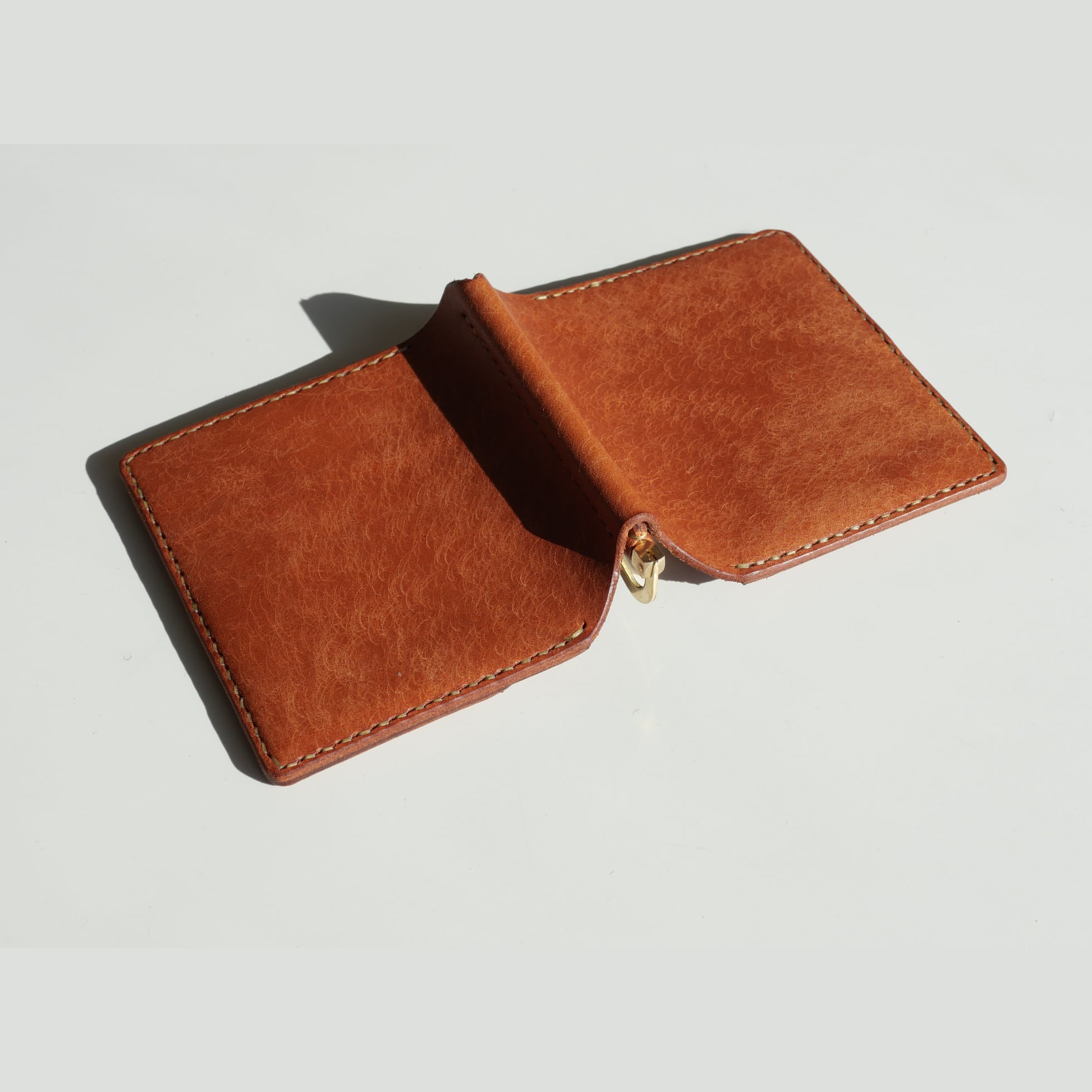 試作段階で気になった「金具を取り付けている部分(谷折りの所)」の縫い糸の露出を解消するため、金具を革で包み込み、内側に取り付ける構造を採用。細部まで上品さを損なわない工夫です。