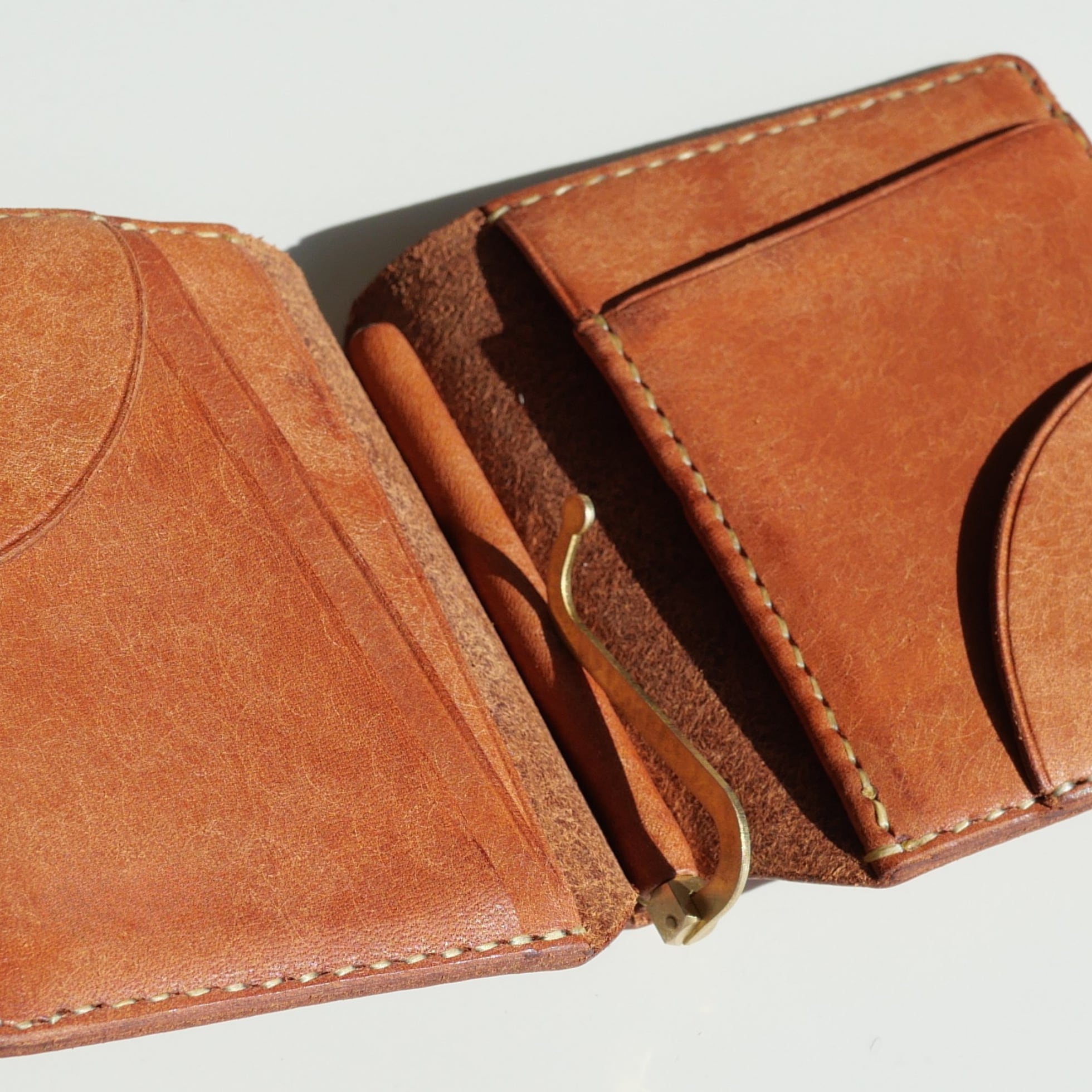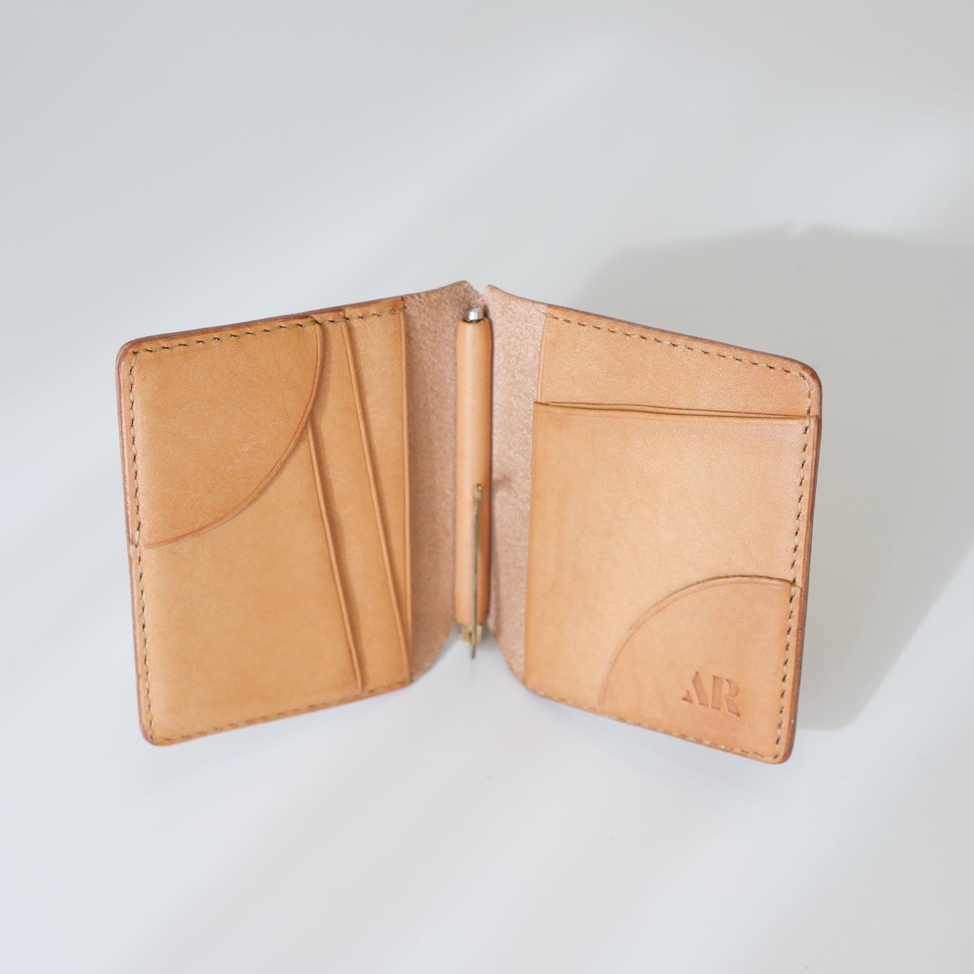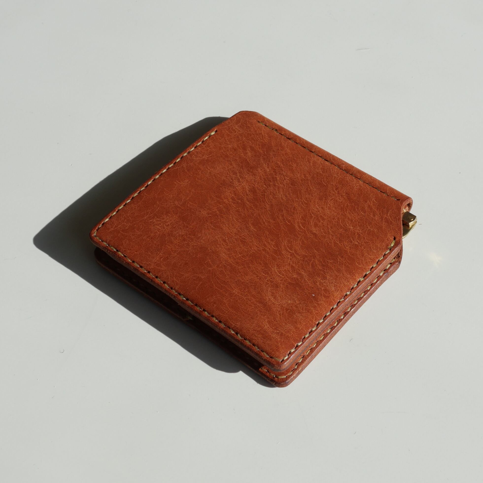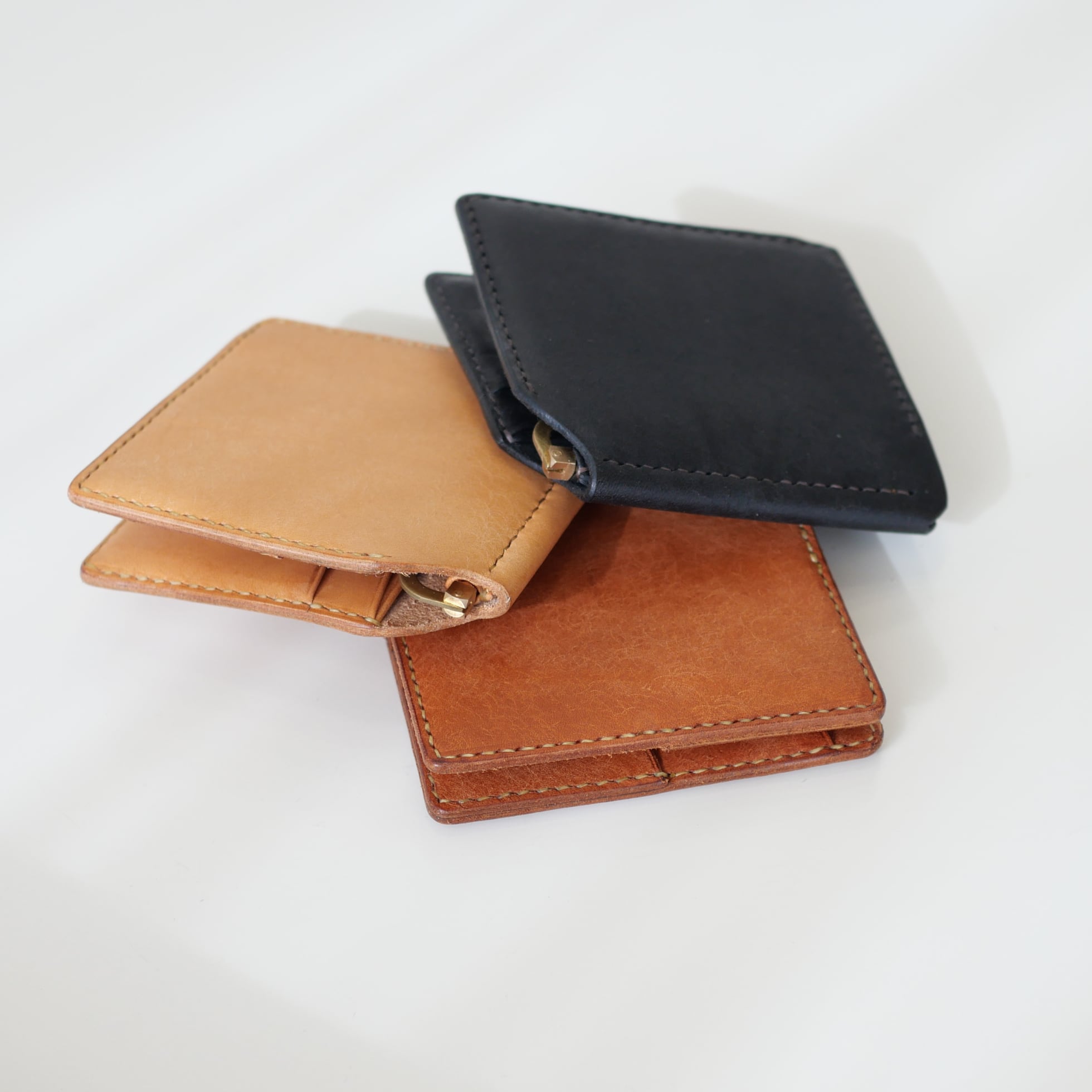 カード入れには珍しい縦型を採用。革チップを備えながらもカードがスムーズに取り出せる設計で、独特のフォルムが生まれました。もちろん革チップを使わずとも、マネークリップとして十分に機能します。