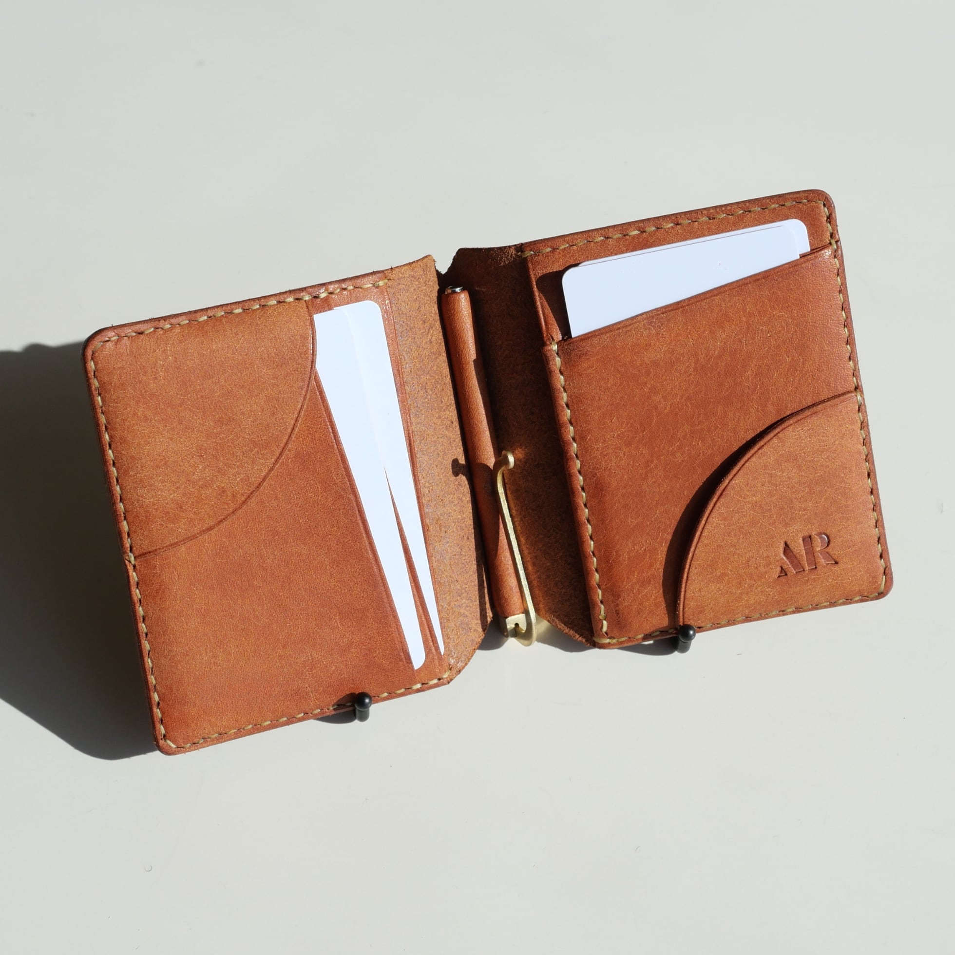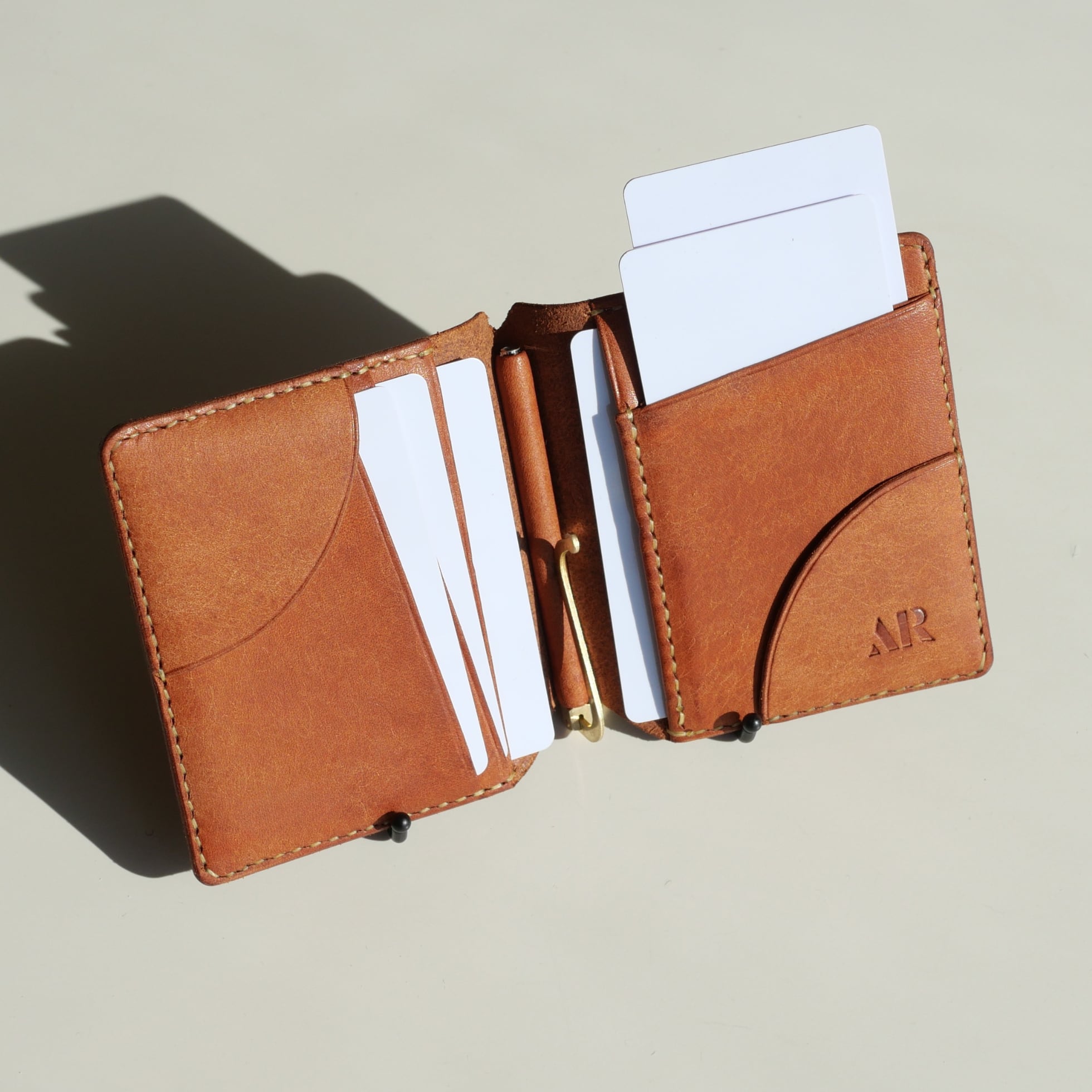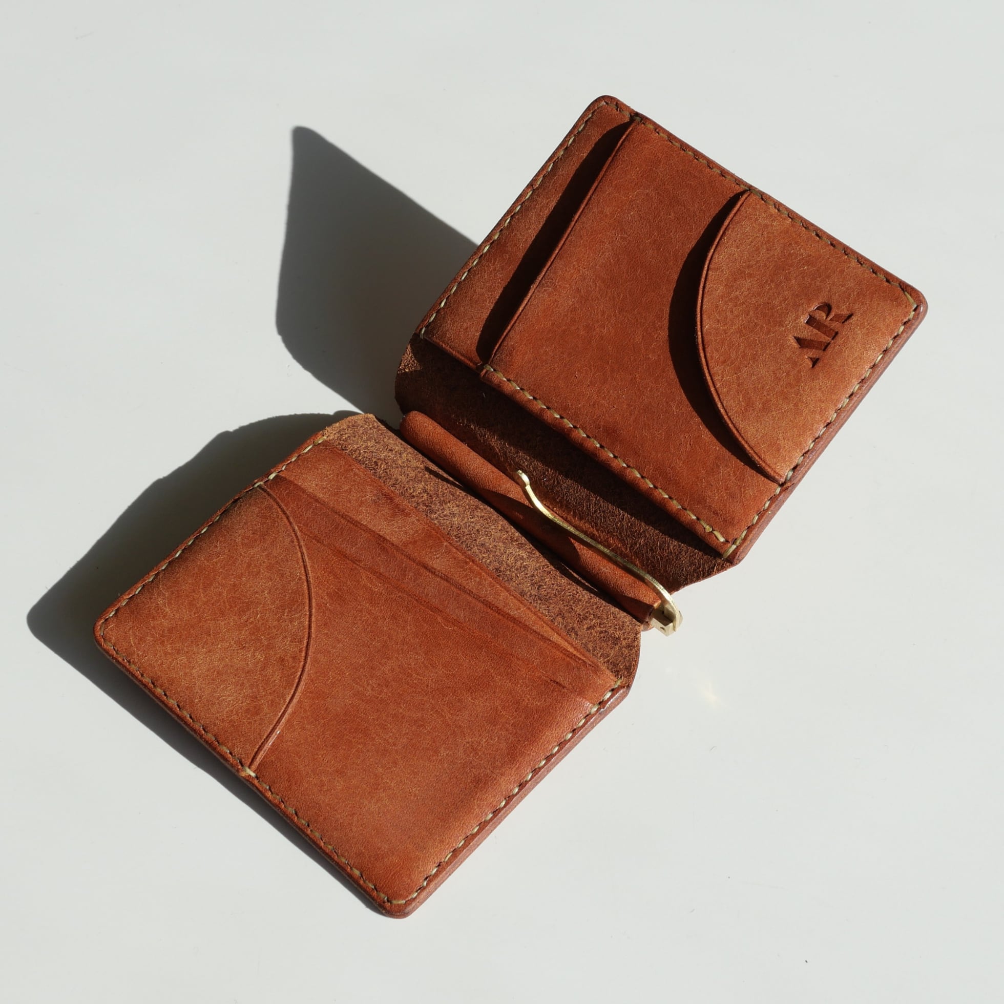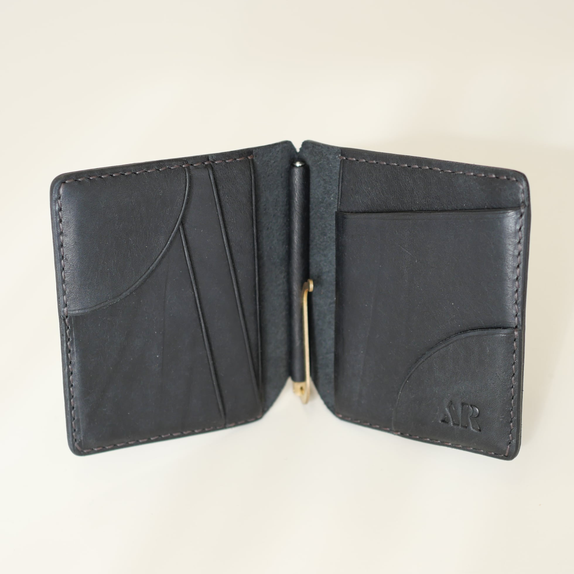 カード入れには珍しい縦型を採用。革チップを備えながらもカードがスムーズに取り出せる設計で、独特のフォルムが生まれました。もちろん革チップを使わずとも、マネークリップとして十分に機能します。